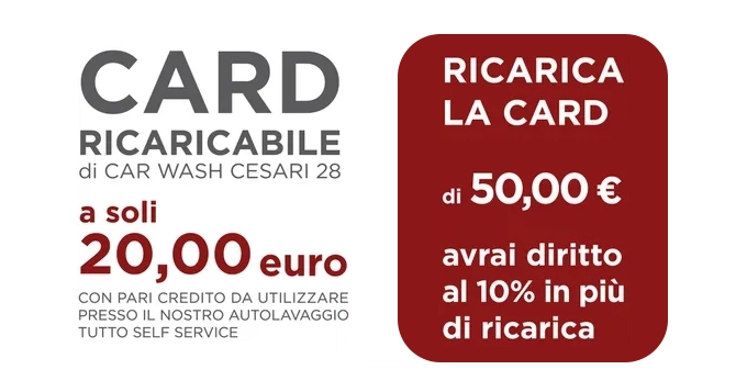 Ricaricando la tessera di almeno 50 euro, si ha diritto ad uno sconto del 10% su ogni lavaggio effettuato presso l’autolavaggio.